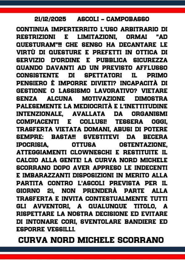 Curva Nord Michele Scorrano Campobasso “Ad Ascoli non ci saremo”