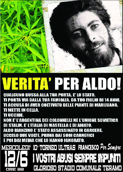 Anche quest’anno riproponiamo quest’importante iniziativa alla quale teniamo tanto e non perché abbiamo voglia di puntare il dito verso qualcuno, ma perché abbiamo una grandissima sete di giustizia vera, perché desideriamo fermamente che finisca lo schifo che proviamo quando la vita di un cittadino viene spezzata per mano di rappresentanti dello Stato e, un evento di tale gravità, non abbia la stessa giustizia o la stessa rilevanza che si concede a qualsiasi altro caso non rappresenti un abuso di potere da parte di chi dovrebbe, al contrario, tutelare le vite e le esistenze dei cittadini. Siamo delusi, per esperienza “personale”, da quegli organi che dovrebbero garantire giustizia a tutti e riteniamo che solo con una presa di coscienza dal basso si possono realmente cambiare le cose: per questo crediamo nell’importanza di questa iniziativa, perché se anche questa rappresenta solo un altro granello di sabbia nell’arido deserto della disinformazione generale, siamo convinti che possa comunque servire a smuovere le coscienze di chi ha ancora il coraggio di non girare lo sguardo dall’altra parte e di fermarsi, invece, a riflettere. Quest’anno abbiamo deciso di raccontare la storia di Aldo Bianzino. Aldo viene arrestato venerdì 12 ottobre 2007 a Pietralunga, nella sua casa di campagna vicino Città di Castello, per coltivazione e detenzione di canapa indiana e trasferito nella stessa giornata al carcere di Capanne a Perugia, dove deve restare in isolamento almeno fino a lunedì 15 ottobre, quando incontrerà il giudice titolare dell’inchiesta. Sabato 13 ottobre alle ore 14 il legale d’ufficio incontra Aldo e riferisce alla moglie di averlo trovato in buona salute. Domenica 14 ottobre, al mattino, la famiglia viene informata che Aldo è morto. Aldo sarebbe morto per malattie cardiache e non presenterebbe segni esterni di violenza; conoscendo Aldo come persona sana, la famiglia non ci crede e chiede l’autopsia. L’autopsia viene affidata al dott. Lalli, un medico legale noto per essere eticamente irreprensibile e dal cui esame risulta che Aldo è morto per cause non accidentali e che il suo cadavere presenta chiari segni di lesioni traumatiche: 4 ematomi cerebrali, fegato e milza spappolati, 2 costole fratturate. Il giudice Petrazzini (lo stesso che aveva condotto l’inchiesta sulla coltivazione e detenzione di canapa indiana) apre formalmente una indagine per omicidio volontario, ma, a tutt’oggi, l’unico finito sotto processo è Gianluca Cantoro, una guardia carceraria, condannato a un anno e mezzo con pena sospesa, colpevole di omissione di soccorso, falso e omissione di atti d’ufficio. Pena ridicola se confrontata alla gravità del reato. Perché quella notte le cose andarono diversamente da come si ostina a raccontarle la guardia del carcere. Aldo Bianzino non morì all’improvviso per un aneurisma celebrale – come hanno cercato di dimostrare, senza riuscirci, i periti della difesa della guardia carceraria – ma si è spento lentamente e fra atroci dolori per un’emorragia cerebrale detta subaracnoidea, dalla quale avrebbe potuto salvarsi se accompagnato d’urgenza in ospedale. Invece, nonostante le urla e i lamenti del prigioniero – in carcere perché in possesso di alcune piantine di canapa indiana – nessuno corse in suo aiuto. Cantoro finse di non sentire e il medico non arrivò se non per constatare il decesso. Sin da subito, l’agente ha cercato di truccare i registri per camuffare la sua colpa e l’amministrazione carceraria – nel panico per l’accaduto – prima ha creduto alla tesi di un complotto di detenuti contro la polizia penitenziaria, poi alla versione del campanello d’emergenza rotto.I legali e i periti della famiglia Bianzino hanno spiegato con chiarezza in aula, documenti alla mano, che Aldo avrebbe potuto salvarsi vista la vicinanza al carcere di Capanne di un ottimo ospedale, quindi, come precisa il legale Fabio Anselmo, “la negazione del soccorso a una persona imprigionata altro non è che tortura, alla faccia dell’articolo 13 della Costituzione”. Perché su questo caso si adombrano anche forti sospetti di torture fisiche subite prima del decesso. Sospetti che è stato impossibile verificare, visto che il giudice ha archiviato la faccenda e dunque gli accertamenti incrociati sul legame fra le cause della morte, la colpa del secondino e l’eventuale compartecipazione di chi disponeva delle chiavi della cella. Perché l’agente condannato non le aveva, quindi non c’entra con le botte, tante, date ad Aldo e i cui segni erano evidenti sul cadavere. L’autopsia parlava chiaro: Aldo è morto per cause non accidentali e il suo cadavere presentava chiari segni di lesioni traumatiche. Eppure il pm, Giuseppe Petrazzini, che ha comunque incentrato 65 domande su 120 sulle cause della morte, ha poi rinunciato a dimostrare che Aldo avrebbe potuto essere salvato, evitando quindi di aggravare il capo d’imputazione contro l’agente di polizia penitenziaria che avrebbe previsto il doppio della pena dato che dall’omissione di soccorso è scaturita la morte. Il tutto con il risultato che ai figli di un uomo entrato in carcere in perfetta salute e morto in poche ore non è restata che la rabbia e la frustrazione. La sentenza è un passo avanti verso la Verità, che resta però ancora tutta da appurare. |